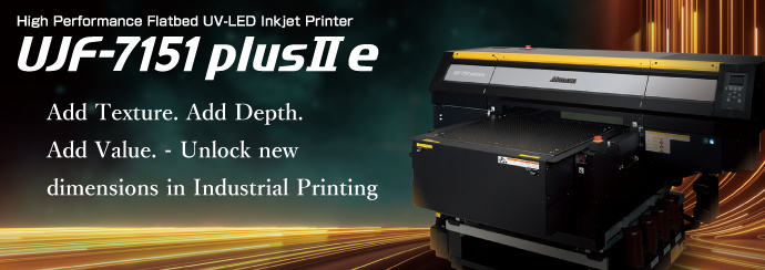 The UJF-7151 plusII e is a high-performance model that retains the high-quality printing up to 1800 dpi, highly precise positioning, heavy media compatibility, and stability evaluated in the previous model, the UJF-7151 plusII. It further pursues enhanced “Print Higher” and “Print Deeper” capabilities, along with improved productivity and reduced running costs.